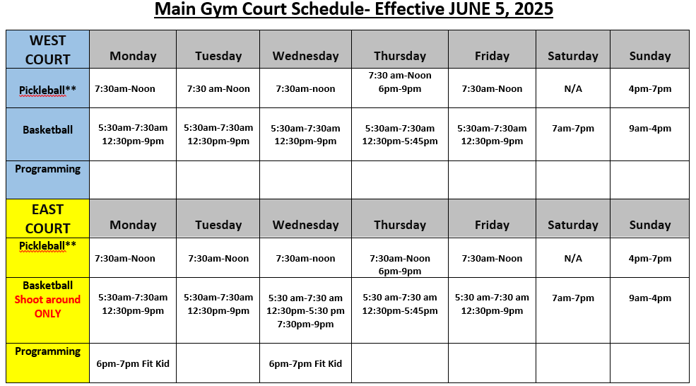 Pickelball play times may be reduced due to programming, holidays, and/or other days that schools are not in session.